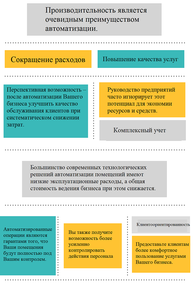 Перспективная возможность – после автоматизации Вашего бизнеса улучшить качество обслуживания клиентов при систематическом снижении затрат. Руководство предприятий часто игнорирует этот потенциал для экономии ресурсов и средств. Большинство современных технологических решений автоматизации помещений имеют низкие эксплуатационные расходы, а общая стоимость ведения бизнеса при этом снижается.